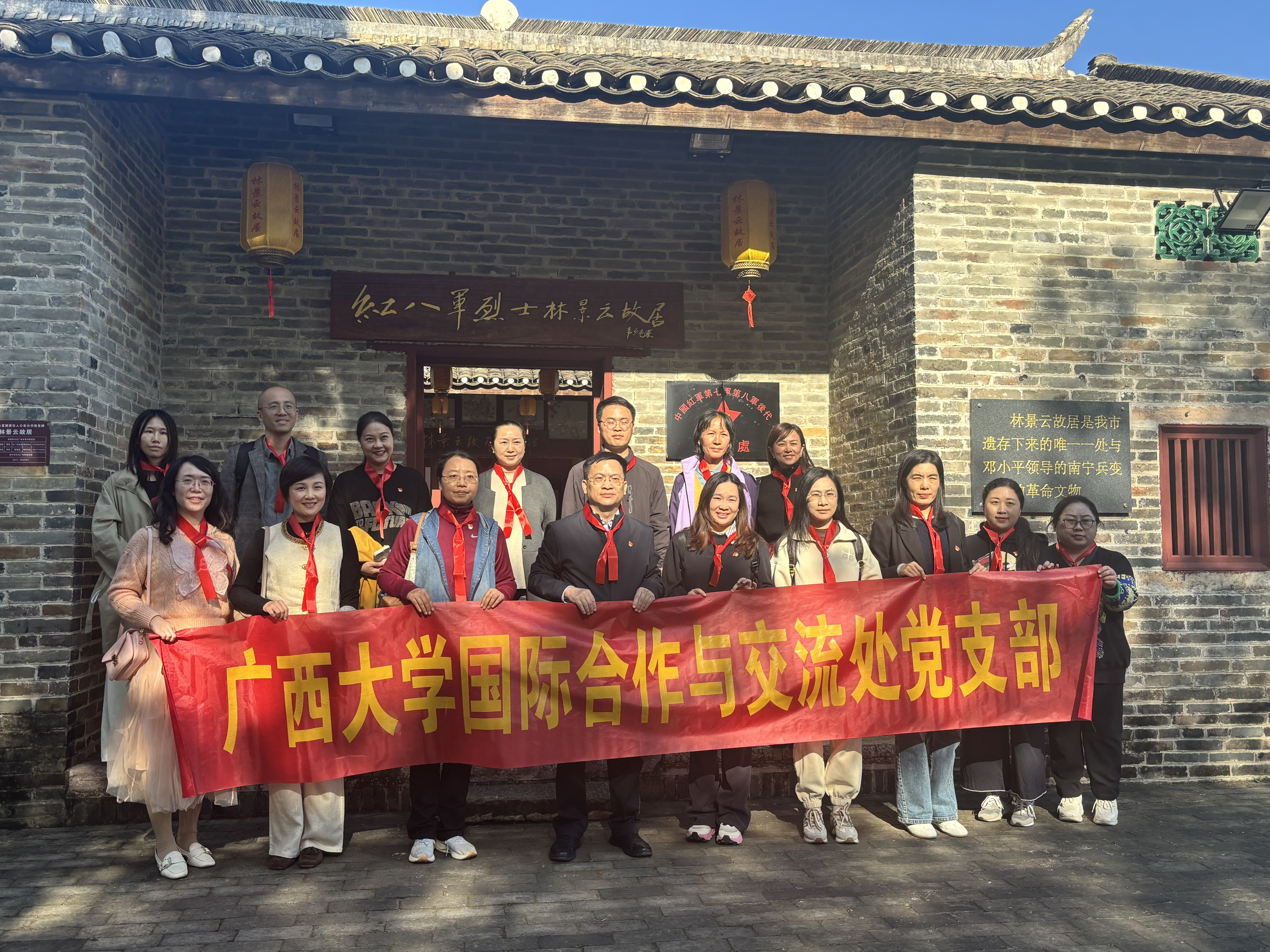 在庄严肃穆的故居广场,全体党员佩戴上象征龙州起义精神的红领巾,整齐列队合影留念。随后,在烈士后人林宝珠女士的讲解中,大家参观了百年老宅、革命旧址等历史场景,通过一件件实物、一张张图片,深入了解了林景云烈士开展地下革命工作的英勇事迹。在红色文化传承教育课堂,全体党员聆听了林景云烈士的革命故事,观看了《壮士归来》纪录片,深切感受革命先烈坚定的理想信念和崇高的献身精神。