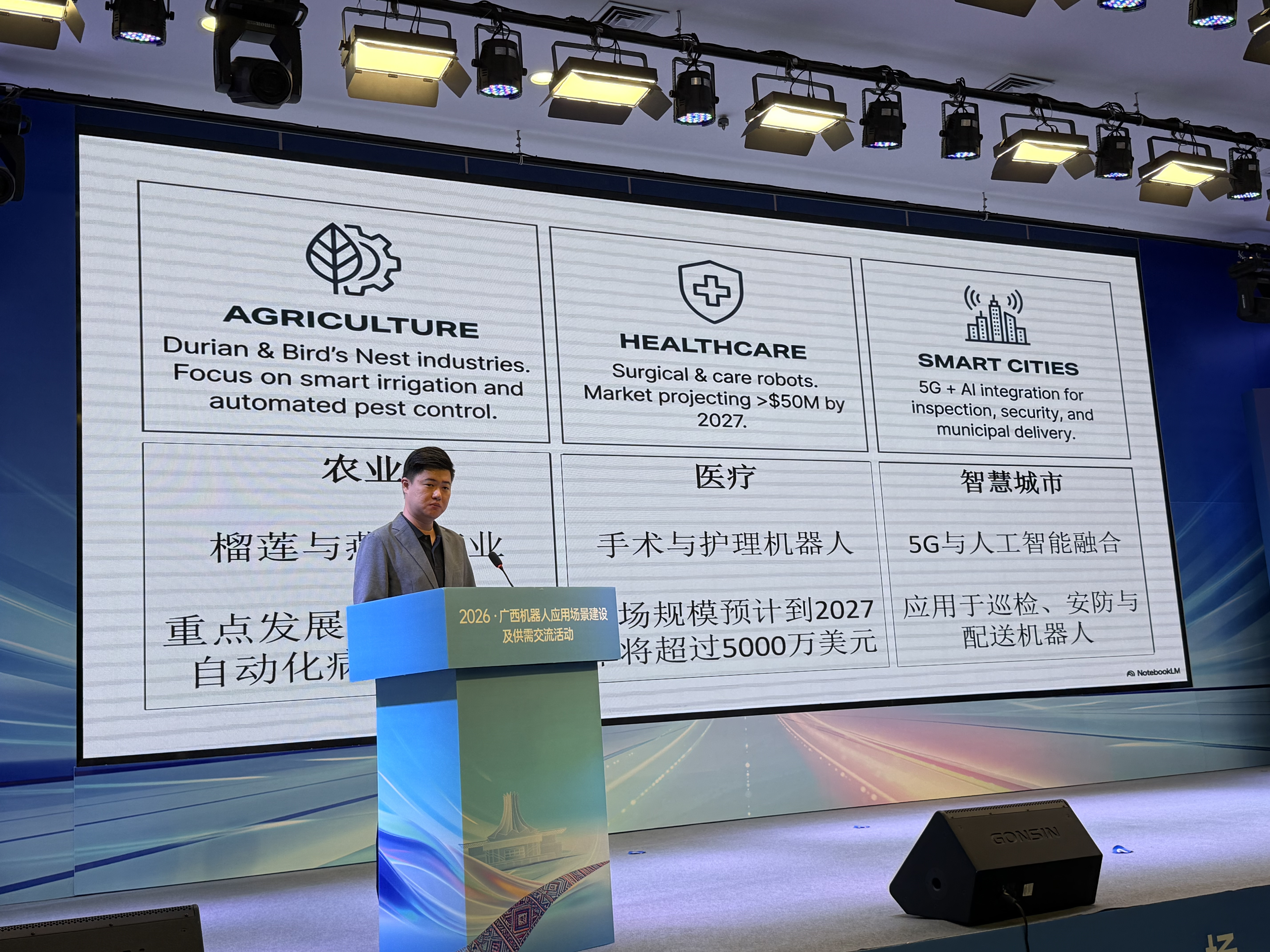 4月2日,由自治区工业和信息化厅主办的广西机器人应用场景建设及供需交流活动在广西机器人产业创新中心成功举办,我校作为协办单位深度参与。会上,我校引进的东盟杰出青年科学家陈大文博士(Dr. Tan Tai Boon)受邀发表主旨讲话,为人工智能与机器人技术赋能东盟产业贡献了西大智慧。
